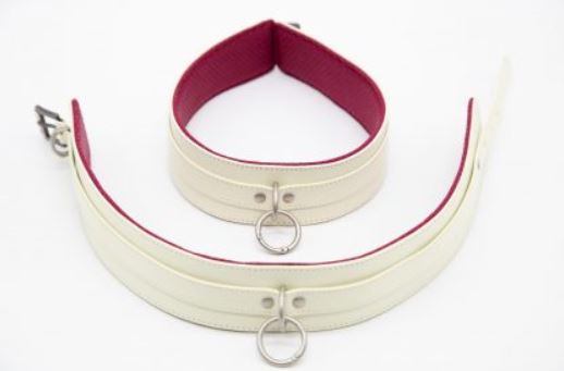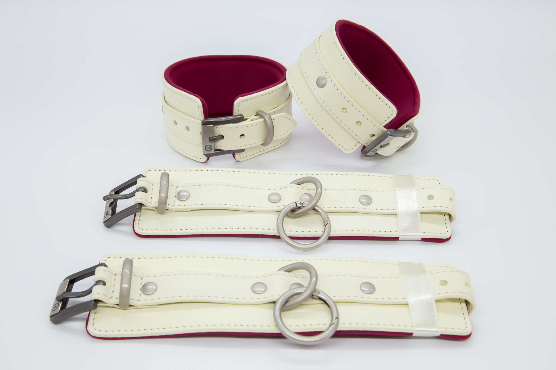 Farbe(n): Bisher gibt es die Oberschenkelfesseln in vier Farbvarianten. Cremeweiß-Rot, Cremeweiß-Schwarz, Schwarz-Rot und Schwarz-Lila (wobei sich wie bisher die erste Farbe auf das äußere Leder bezieht).