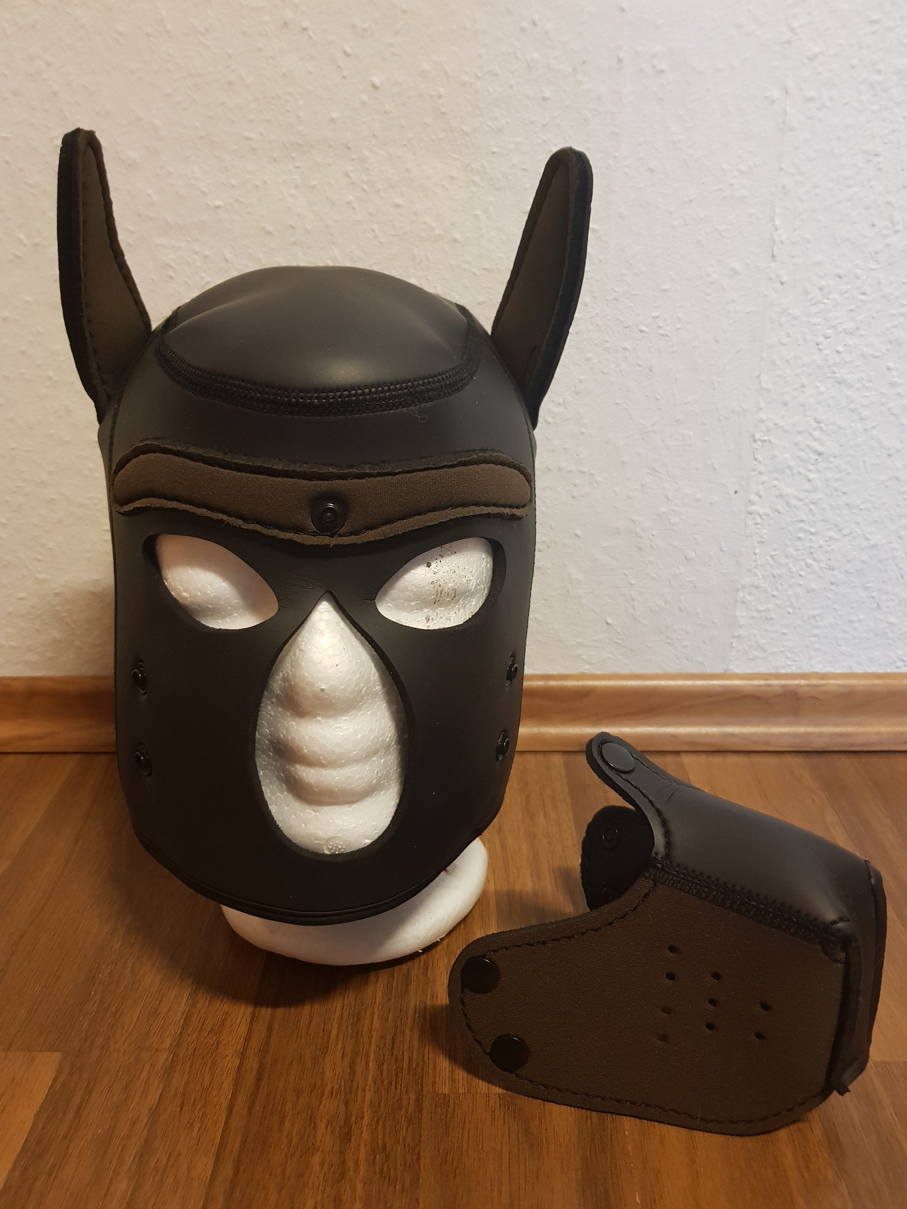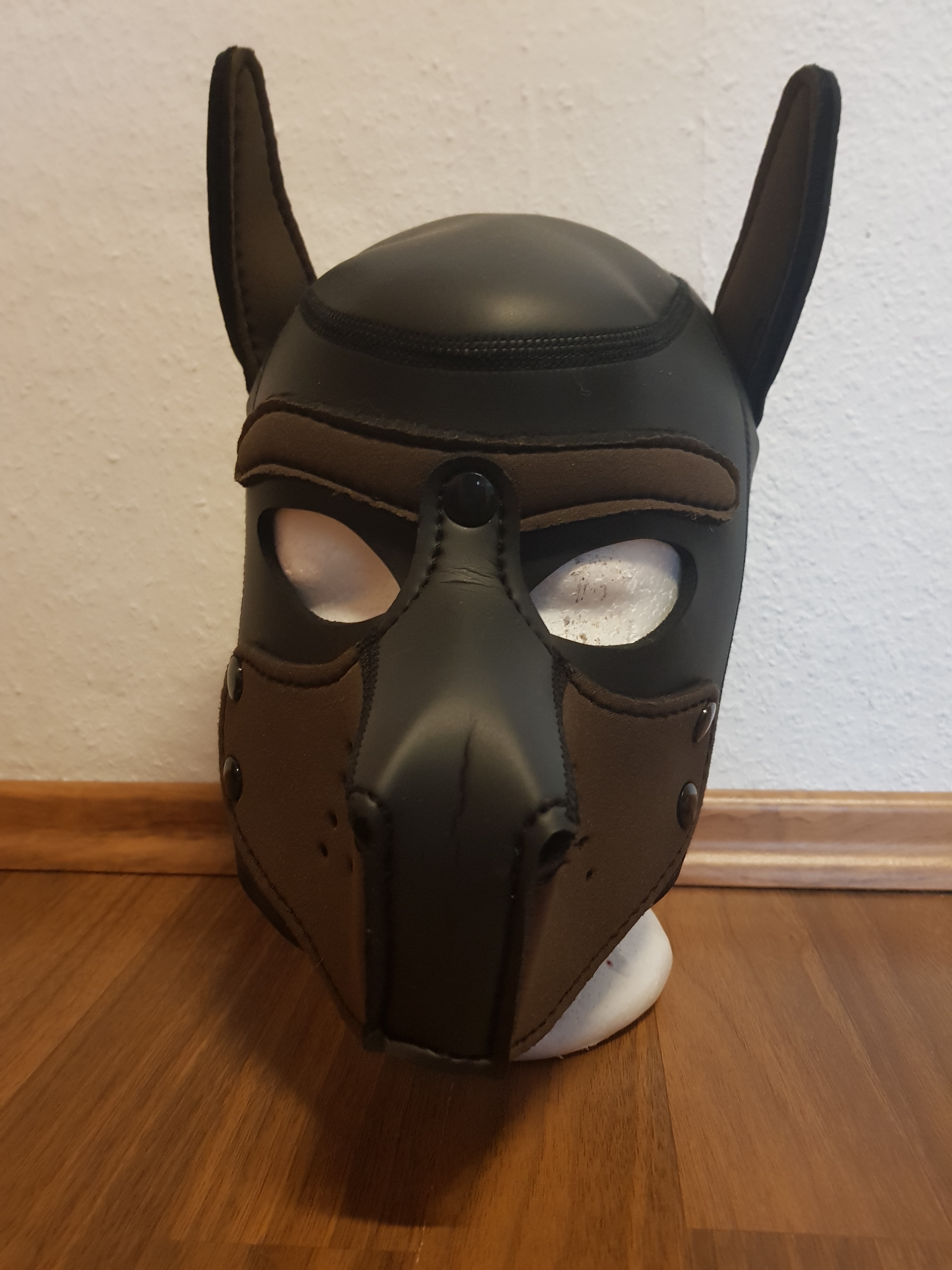 Tiermasken haben für mich etwas ganz persönliches. Ich habe bereits ein zwei Menschen aus dem Bereich kennengelernt und sie verbinden damit ein ganz eigenes Identitätsgefühl. Das kann ich gut nachempfinden. Mit Hundemaske jeglicher Art empfindet man sich einfach anders, wie ich euch ja bereits in meinem Bericht zum ManiFest Maskenball erzählt habe. Also könnt ihr euch vorstellen, wie aufgeregt ich war mich in Sasha zu verwandeln. Vorweg muss ich ehrlich sagen, dass Neopren echt unangenehm riecht. Zumindest ist mir der Geruch viel zu intensiv und ich musste sie erst mal etwas beiseite legen und auslüften lassen. Da ich glücklicherweise einen Styroporkopf besitze, konnte ich dort die Hundemaske wunderbar lagern und auch in ihrer Gänze betrachten. Dennoch kann man nicht bestreiten, wie angenehm sie sich anfühlt. Neopren ist ein weicher, anschmiegsamer und auch dehnbarer Stoff. Da es der gleiche Stoff ist, aus dem auch Taucheranzüge hergestellt werden, ist es gar nicht schlimm, wenn die Hundemaske mit Wasser in Verbindung kommt. Oder womit auch immer ihr gerne spielen möchtet. Nicht unerheblich ist auch, dass sie fest sitzt. Nichts wackelt unangenehm, man kann in ihr herumlaufen, springen, rennen und alles bleibt dort sitzen, wo es hingehört. Das ist für ein ausgelassenes Spiel letztlich nicht ganz belanglos. Man muss nicht lange etwas einstellen, an Riemen ziehen oder sonstiges. Solange man seine Haare gebändigt bekommt, lässt sie sich leicht übersteigen, zurechtrücken und schon kann es losgehen. Das macht den Look auch einfach natürlicher und schließt ihn perfekt ab.