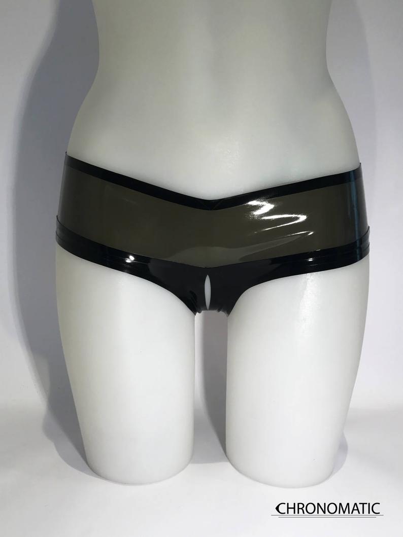 Da sicher nicht jeder weiß, was ein Ouvert ist, lasst es mich euch erklären. Als Ouvert bezeichnet man Damenunterwäsche, welche entweder die Brustwarzen zeigt (trotz Tragen eines BHs) oder die weiblichen Genitalien freilegt. Kurzum: das süße und freche Höschen hat eine Öffnung am Intimbereich. Sie besteht aus schwarzem Latex und hat einen gewagten Einsatz von grau-transparentem Latex in dem Bereich, wo ihr beim Tragen auch so normalerweise nichts sehen würdet. Sofern man nicht sie Beine spreizt, bleibt alles gut versteckt und man kann mit den weiblichen Reizen spielen.