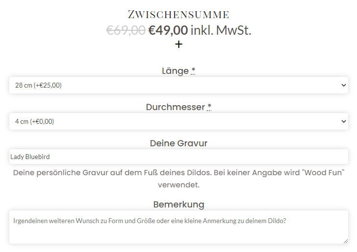 Zusätzlich habt ihr, egal ob vor oder nach dem Formgestalten, die Chance die Gesamtlänge von eurem Wood Fun Dildo zu bestimmen. Als Normalmaß ist 22 cm ausgewählt. Je größer, desto mehr Aufpreis gibt es. Ich habe mich mal für eine Übergröße mit insgesamt 28 cm entschieden, da ich mir gerne anschauen wollte, wie genau alle Vorstellungen übertragen und umgesetzt werden. Ihr habt hier eine Reichweite von 16 cm bis hin zu 40 cm… das sollte für jedermann und Frau reichen, denke ich. Zudem lässt sich auch noch der Durchmesser bestimmen. Hier liegt der kleinste Durchmesser bei 3 cm und der größte bei ganzen 10 cm. Daher lässt sich euer Dildo wirklich optimal und auf euren Bedarf einstellen.