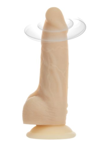Kommen wir zum Rotating Dong selbst. Er besteht aus ganz besonderem Silikon. Ich weiß nicht genau, was in der Herstellung anders ist, aber es ist mit keinem anderen Toy, was ich bisher in der Hand hatte, vergleichbar. Das Material gleitet geschmeidig über die Haut und ist so samtig angenehm, dass man kurz denken könnte, es ist gar kein Silikon. Dazu fühlt man die einzelnen Adern und Strukturen des Vibrators. Denn dieser hat ein naturgetreues Design bekommen. Das ist zwar nichts, was mir persönlich gefällt, aber dennoch ist es beeindruckend, wie ähnlich das Modell einem eigentlichen Penis mit allem Drum und Dran, wie den Hoden, kommt. Ein Stück darunter befindet sich ein starker Saugnapf, inklusive Ladeport. So könnt ihr euren Rotating Dong ganz einfach überall fest pappen. Zudem war der Vibrator auch geruchsneutral. Keine unangenehmen Plastikgerüche oder ähnliches waren wahrzunehmen. Da es keine Rillen, Nähte oder sonstige Unannehmlichkeiten bei dem Vibrator gibt, stellt sich die Reinigung als sehr einfach dar. Er ist Spritzwassergeschützt, allerdings müsst ihr darauf achten, dass die Unterseite vom Saugnapf (wegen dem Ladeport) nicht ins Wasser kommt! Ansonsten könnt ihr ein feuchtes Tuch mit milder Seife oder einfach einen ToyCleaner nutzen. Auch wenn der gesamte Rotating Dong außen aus Silikon besteht, verbirgt sich im Inneren natürlich einiges an Technik. Dadurch ist der Schaft als solches nicht weich oder stark biegsam. Dennoch lässt sich das Material außen leicht eindrücken, was ihn leicht realistischer macht. Die Spitze ist im vergleich dazu besonders weich und biegsam und der Hoden ist eher stramm, lässt sich aber auch eindrücken, da an diesen beiden Stellen keine Technik direkt darunter liegt.