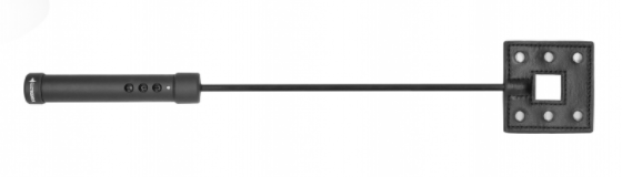 Die E-Stim Crop ist schlicht und dennoch sehr schön designt. In einem schwarzem Look wirkt sie sehr erhaben und setzt sich aus dem Griff und dem oberen Paddle zusammen. Dabei ist sie sehr gut ausbalanciert und liegt angenehm in der Hand- Sie besteht oben aus PU Leder, hat für die Elektrostellen Metall verarbeitet und der griff besteht aus ABS. An diesem sind zum einen die drei Knöpfe, zum anderen der Lade Port. Aber macht euch keine Sorgen, die Gerte könnt ihr natürlich aufladen und ganz ohne Kabel nutzen. Ich glaube gerade bei einer Gerte wäre kaum etwas nerviger als ein hinten dranhängendes Kabel. Oben im Leder am Paddle befinden sich links und recht drei kleine Metallpunkte, über welche die elektronischen Shocks weitergeleitet werden. Schock mag hier wohl etwas zu viel klingen, aber macht euch keine Gedanken, dass klingt härter als es ist.