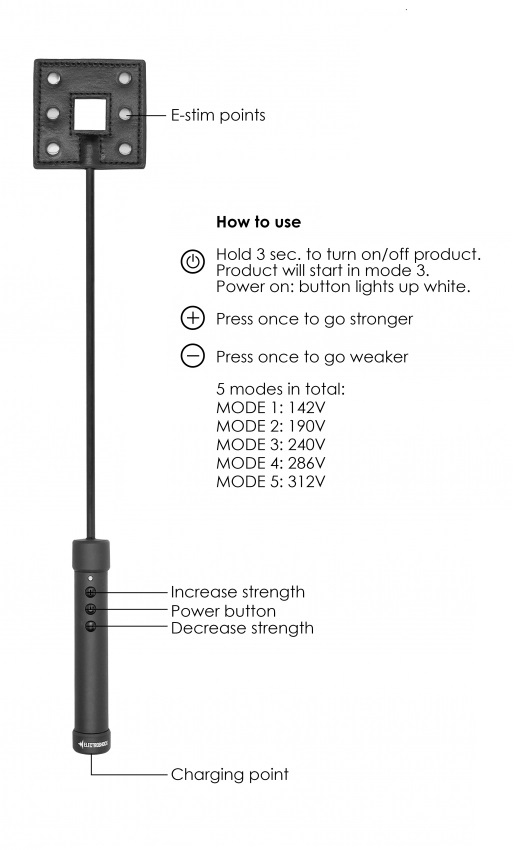 Am Griff der E-Stim Crop befinden sich insgesamt drei einfach zu bedienende Druckknöpfe. In der Mitte befindet sich ein Power-Symbol, haltet dieses einfach für 3 Sekunden gedrückt, um eure E-Stim Optionen der Gerte an oder wieder auszuschalten. Insgesamt hat sie übrigens 5 Modi und ihr startet automatisch auf Level 3. Wenn ihr euch nicht sicher seid, ob ihr lange genug gedrückt habt, könnt ihr euch durch das weiße LED-Licht versichern, welches sich anschaltet am Knopf, sobald ihr die Gerte aktiviert habt. Der obere Plus-Knopf lässt euch einfach eine Intensität hochschalten und der Minus-Knopf hingegen schaltet wieder um eine Intensität weiter runter. Damit ihr eine Vorstellung habt, wie viel Volt die einzelnen Modi haben, habe ich euch eine Liste angefertigt:
