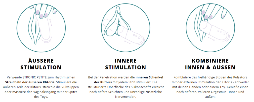 Der Stronic Petite lässt sich leicht nutzen und bietet diverse Spielmöglichkeiten an. Zum einen ist er ein Pulsator, sodass seine Besonderheit darin liegt, dass er von alleine Stoßen kann. Dadurch bietet der Stronic Petite auch ganz neue Wege, zum Orgasmus zu gelangen. Zum einen könnt ihr ihn natürlich nutzen, um eure Schamlippen und die Klitoris zu stimulieren. Denn viele vergessen, dass die Klitoris nicht nur die kleine Perle vorne ist, denn sie geht unter der Haut noch viel weiter und freut sich auch an anderen Stellen über schöne Stimulationen. Zum andern könnt ihr euch nun wirklich ganz Hand-frei zurücklehnen und den Pulsator die Arbeit für euch machen lassen. Zum Beispiel könnt ihr euch dafür hin Knien und zurücklehnen, sodass ihr praktisch auf dem Pulsator drauf sitzt und er etwas Stabilität von eurem Bett 8oder worauf ihr euch setzten möchtet) bekommt. Aber das sind natürlich nur Beispiele und es gibt noch zahlreiche Möglichkeiten, wie ihr euren Stronic Petite einsetzten könnt. Allerdings finde ich persönlich, dass er sich sehr gut zur Klitoris Stimulation eignet und es ein angenehmes Gefühl ist, ihn mit Gleitgel zusammen an der Klitoris sanft vorbei stoßen zu lassen. Aber natürlich könnt ihr ihn auch einfach in der Hand lassen, wenn euch das mehr Sicherheit gibt oder auch mit in die Badewanne nehmen, da er komplett Wasser dicht ist. Somit sind die Ideen und Optionen fast grenzenlos. Falls ihr euren intimen Moment mit eurem Partner teilen möchtet, kann auch natürlich euer Partner den Stronic Petite beispielsweise leiten und ihr lasst euch ganz entspannt zurückfallen. Probiert einfach aus, was sich für euch am besten anfühlt und lasst euch von diesen Gefühlen leiten, bis es in einem Feuerwerk endet.